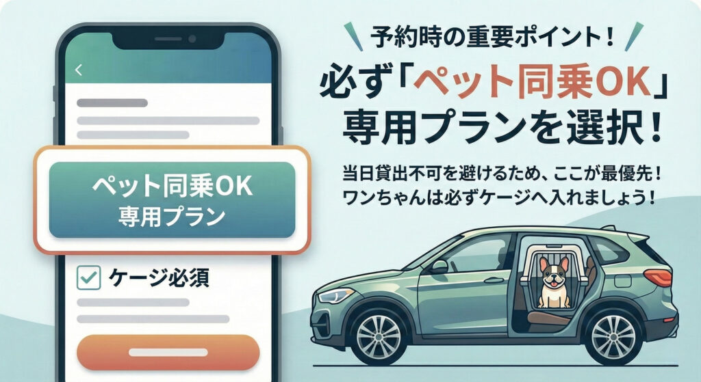 まず一番大切なのは、同じ車種でも「ペットNG」の車両が設定されている場合があるため、必ず「ペット同乗OK」の専用プランやオプションを選んで予約することです。プラン選びを間違えてしまうと、当日ワンちゃんを連れて行っても貸出不可になってしまうので、ここが最優先のチェックポイントになります!