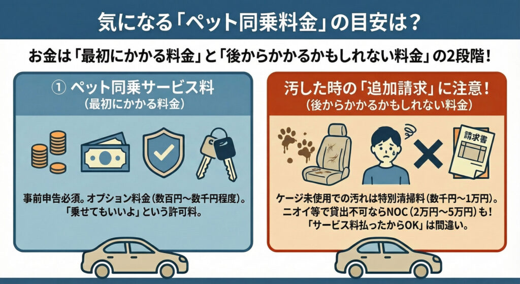 レンタカーでペットを乗せる場合、お金に関しては「最初にかかる料金」と「後からかかるかもしれない料金」の2段階があることを覚えておきましょう!