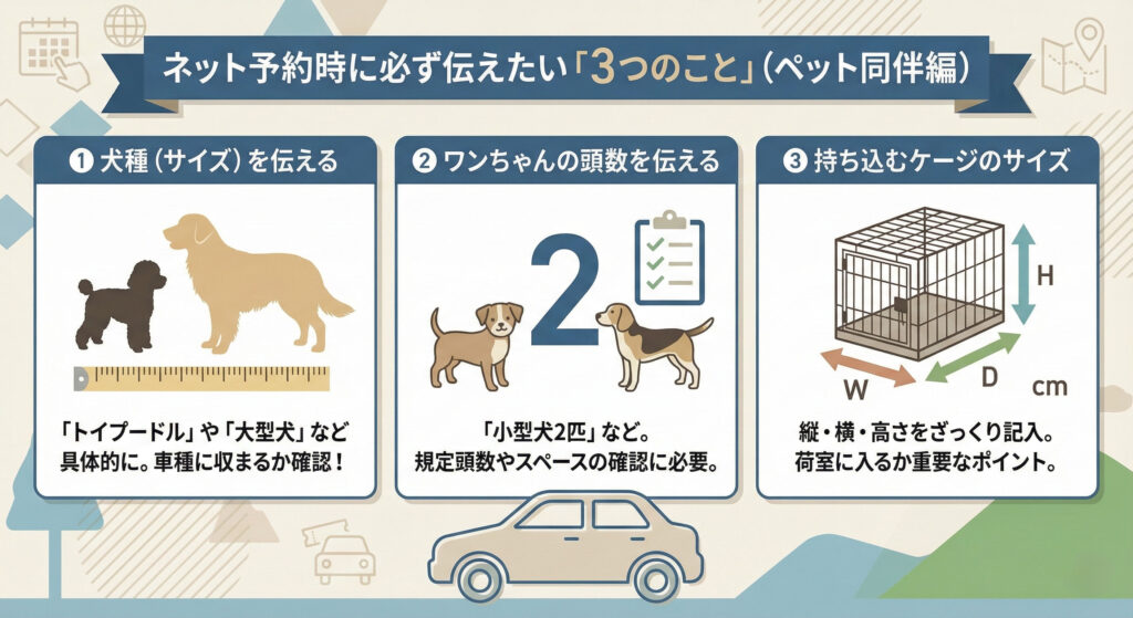 「トイプードル1匹です」など、具体的な犬種や大きさを伝えましょう。大型犬の場合は、予約した車種のスペースに収まるかどうかをお店側が事前に判断してくれるので、当日「乗らなかった…」というミスを防げます。