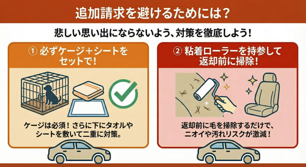 「サービス料を払っているから汚してもOK」というのは大きな間違いです。もしケージを使わずに車を汚してしまうと、通常の掃除で落ちない汚れへの特別清掃料として数千円〜1万円程度が発生します。さらに、ニオイなどが原因で翌日の貸出ができなくなった場合には、休車補償(NOC)として20,000円〜50,000円もの高額な費用がドカンと追加請求されることも…。
