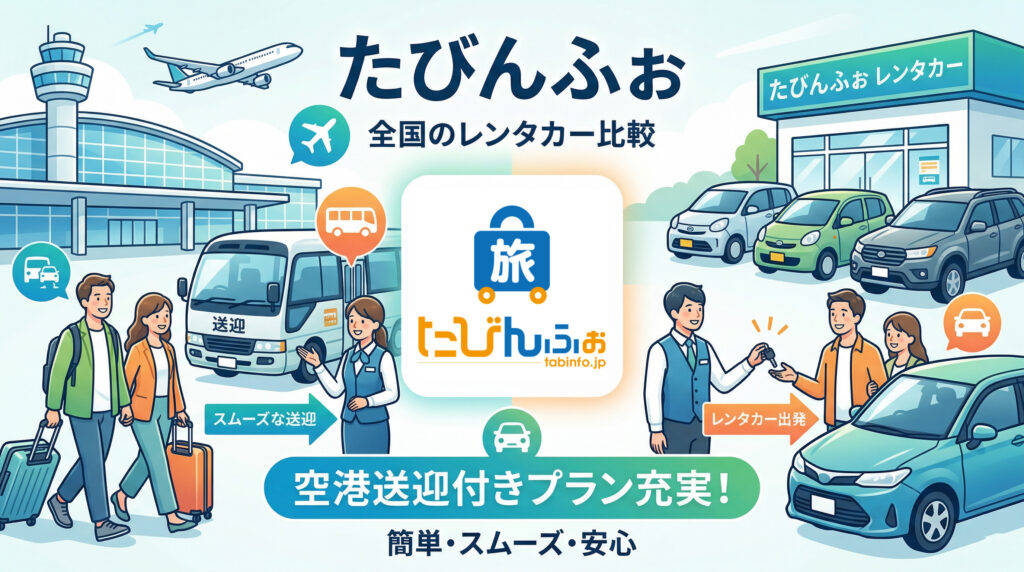 「たびんふぉレンタカー」は空港送迎付きプランが充実!多くの掲載店で無料送迎がセットになっているので、初めての旅でも安心です。※駅周辺など一部例外もあるため、詳細は予約時にプラン内容をサクッとチェックしてくださいね!